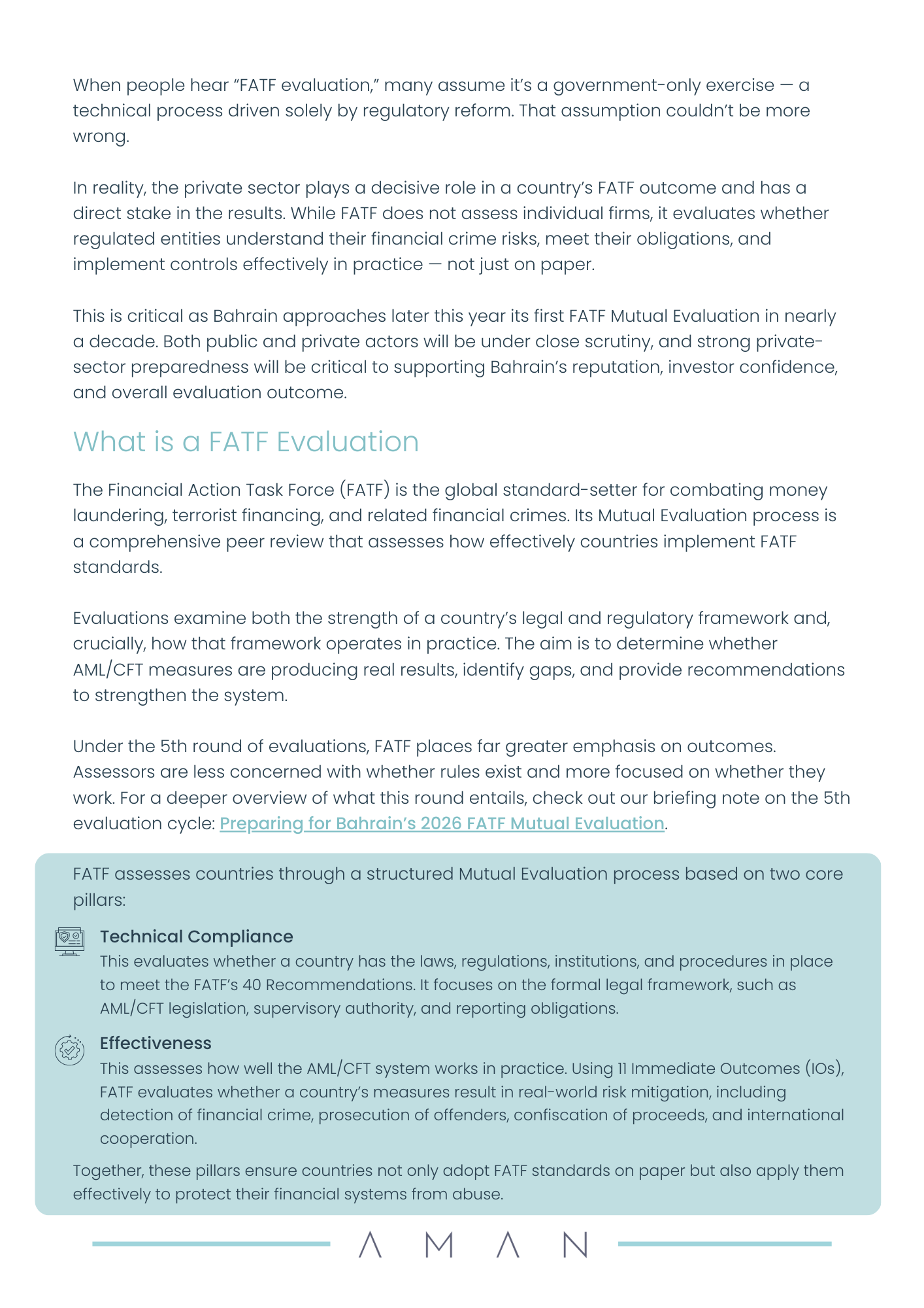 Many assume a FATF evaluation is a government-only exercise. It is not. While FATF does not assess individual firms, it evaluates whether regulated entities understand risk, meet obligations, and implement controls effectively in practice, not just on paper. With Bahrain approaching its first Mutual Evaluation in nearly a decade, private-sector preparedness will be a decisive factor for national outcomes, investor confidence, and international trust.